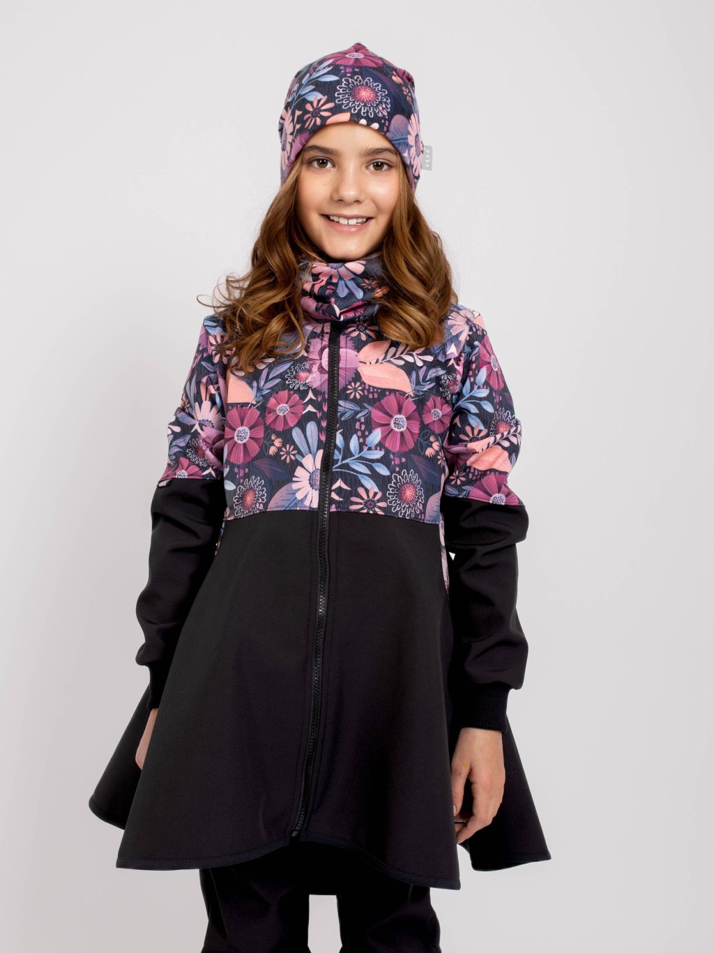 Manteau fille softshell doublé polaire Romantico, Noir, Fleurs magiques